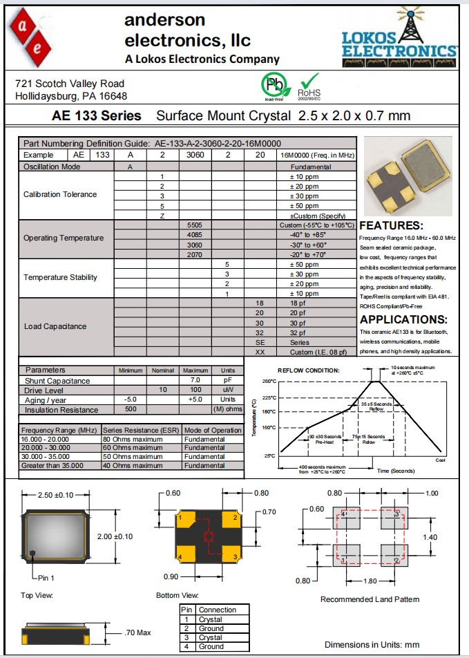 AE-133-A-3-4085-5-20-45M0000,2520mm,Anderson晶體,AE133,移動電話晶振,參數表