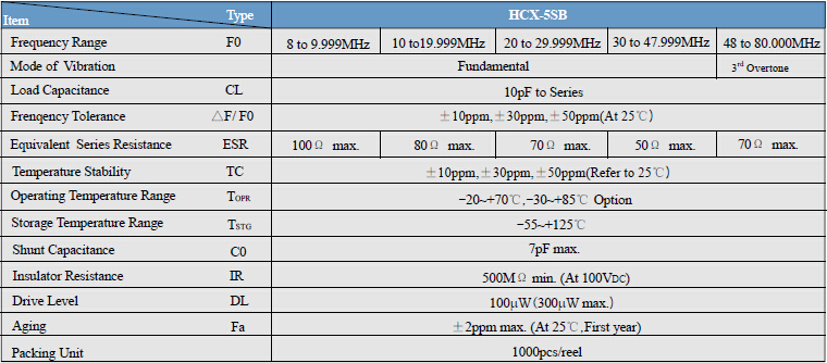 5032mm貼片晶振,HCX-5SB,HCX-6SB,HCX-7SB晶振,鴻星石英晶體諧振器,非常緊湊輕薄(5.0 * 3.2 * 0.9mm MAX)頻率范圍8.0MHZ~80.0MHZ.基準的頻率可以滿足大多數藍牙芯片,優(yōu)良的耐熱性和耐沖擊性,無鉛的產品,這些能滿足使用無鉛焊料回流分析的要求.