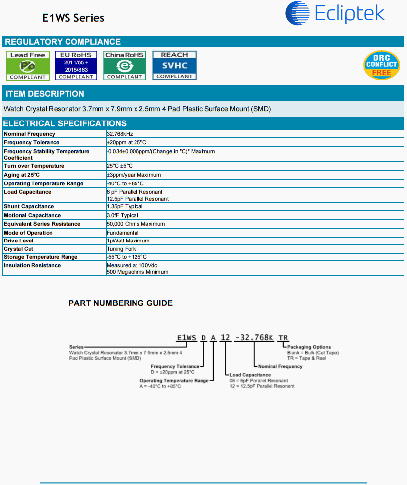| E1WSDA12-32.768K TR | Ecliptek | E1WS | -40°C ~ 85°C | 32.768 kHz | ±20ppm | 12.5 pF | |
