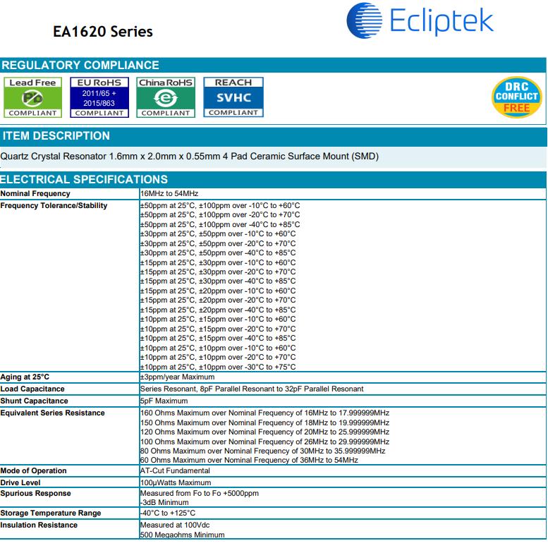 日蝕ECLIPTEK晶振公司將有效率的使用自然資源和能源,以便從源頭減少廢物產生和排放.我們將在關注于預防環境和安全事故,保護公眾健康的同時,努力改進我們的操作.我公司將積極參與加強公眾環境、健康和安全意識的活動,提高公眾對普遍的環境、健康和安全問題的注意.EA1620超小型晶振,日蝕石英晶體,EA1620NA20-26.000M-TR晶振.
