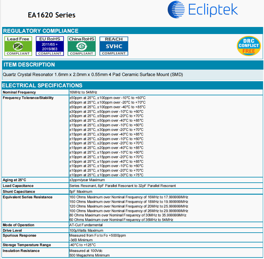| EA1620MA10-25.000M TR | Ecliptek | EA1620 | -40°C ~ 85°C | 25 MHz | ±20ppm | ±15ppm | 10 pF |