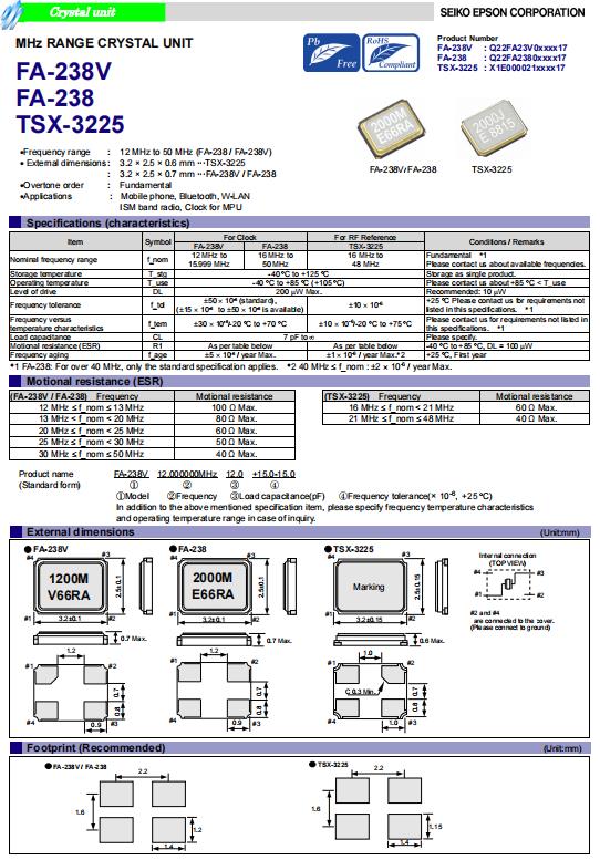 (2) 在設計時請參考相應的推薦封裝.愛普生晶振FA-238,Q22FA23800047無源貼片晶振