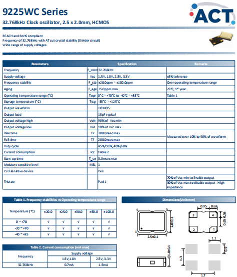 ACT晶振,9225WC晶振,有源晶體振蕩器.貼片晶振本身體積小,超薄型石英晶體振蕩器,特別適用于有目前高速發(fā)展的高端電子數(shù)碼產(chǎn)品,因為晶振本身小型化需求的市場領(lǐng)域,小型,薄型是對應(yīng)陶瓷振蕩器(偏差大)和普通的石英晶體振蕩器(偏差?。┑闹虚g領(lǐng)域的一種性價比較出色的產(chǎn)品.產(chǎn)品廣泛用于筆記本電腦,無線電話,衛(wèi)星導(dǎo)航HDD, SSD, USB, Blu-ray等用途,符合無鉛焊接的高溫回流焊曲線特性.