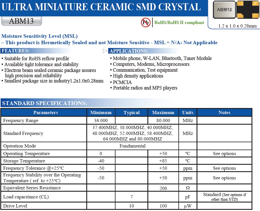 | Abracon晶振 | 單位 | ABM13晶振 | 石英晶振基本條件 |