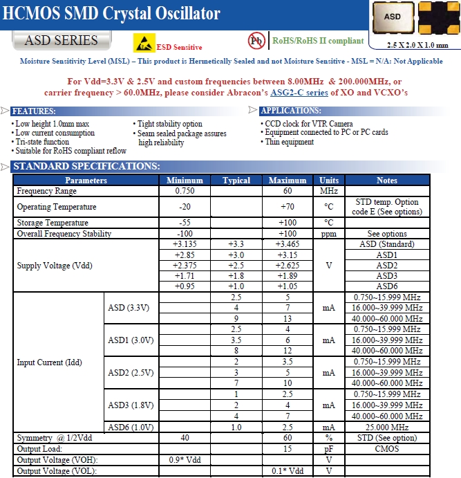 Abracon晶振,ASD3-25.000MHZ-EC-T有源晶體,ASD晶體振蕩器.小體積貼片2520mm晶振,外觀小型,表面貼片型晶體諧振器,因本身體積小等優勢,適用于移動通信終端的基準時鐘等移動通信領域.小型,薄型,輕型具備優良的耐環境特性及高耐熱性強.滿足無鉛焊接的回流溫度曲線要求.