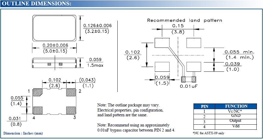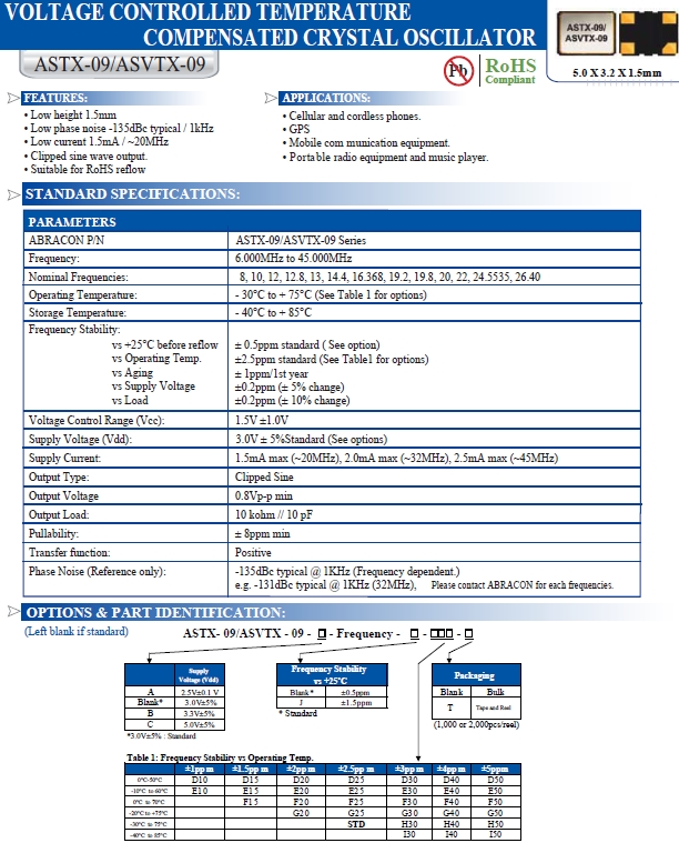 Abracon晶體,Abracon Crystal,ASTX-09振蕩器.貼片式石英晶體振蕩器,低電壓啟動功率,并且有多種電壓供選擇,比如有1.8V,2.5V,3.3V,3.8V,5V等,產品被廣泛應用于,平板筆記本,衛星系統,光纖通道,千兆以太網,串行ATA,串行連接SCSI,PCI-EXPress的SDH / SONET發射基站等領域.符合RoHS/無鉛.