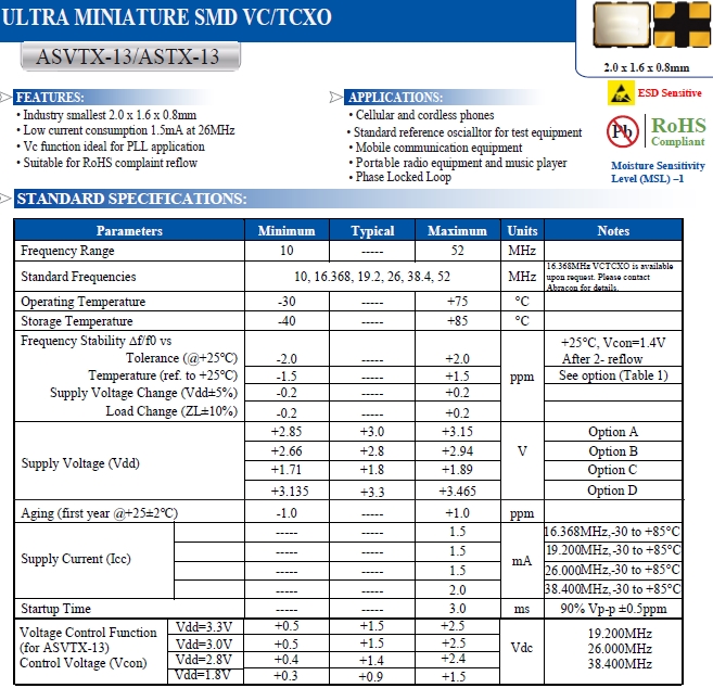 Abracon晶振,有源晶振,ASTX-13貼片晶振.貼片石英晶體,體積小,焊接可采用自動(dòng)貼片系統(tǒng),產(chǎn)品本身小型,表面貼片晶振,特別適用于有小型化要求的電子數(shù)碼產(chǎn)品市場領(lǐng)域,因產(chǎn)品小型,薄型優(yōu)勢,耐環(huán)境特性,包括耐高溫,耐沖擊性等,在移動(dòng)通信領(lǐng)域得到了廣泛的應(yīng)用,晶振產(chǎn)品本身可發(fā)揮優(yōu)良的電氣特性,滿足無鉛焊接的高溫回流溫度曲線要求.