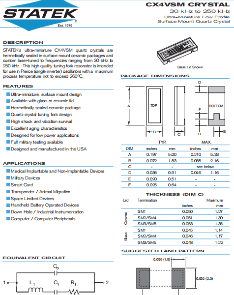 STATEK晶振,CX4VSM晶振,高品質(zhì)晶振.小型貼片石英晶振,外觀尺寸具有薄型表面貼片型石英晶體諧振器,特別適用于有小型化要求的市場領(lǐng)域,比如智能手機,無線藍牙,平板電腦等電子數(shù)碼產(chǎn)品.晶振本身超小型,薄型,重量輕,晶體具有優(yōu)良的耐環(huán)境特性,如耐熱性,耐沖擊性,在辦公自動化,家電相關(guān)電器領(lǐng)域及Bluetooth,WirelessLAN等短距離無線通信領(lǐng)域可發(fā)揮優(yōu)良的電氣特性,滿足無鉛焊接的回流溫度曲線要求.