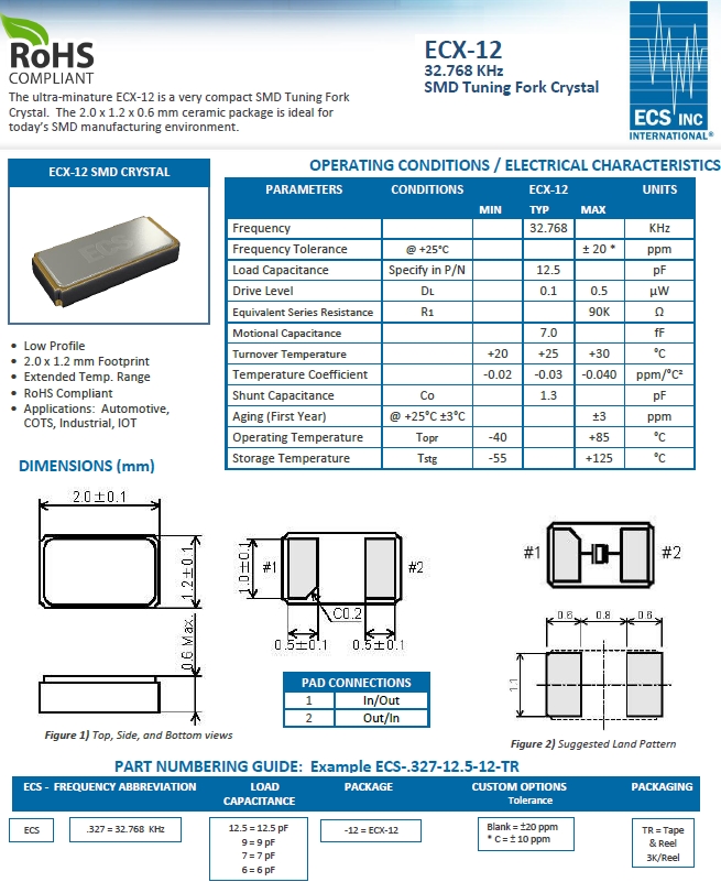 ECS晶振,ECS-.327-12.5-12-TR晶體,ECX-12千赫晶振.貼片石英晶體,體積小,焊接可采用自動(dòng)貼片系統(tǒng),產(chǎn)品本身小型,表面貼片晶振,特別適用于有小型化要求的電子數(shù)碼產(chǎn)品市場(chǎng)領(lǐng)域,因產(chǎn)品小型,薄型優(yōu)勢(shì),耐環(huán)境特性,包括耐高溫,耐沖擊性等,在移動(dòng)通信領(lǐng)域得到了廣泛的應(yīng)用,晶振產(chǎn)品本身可發(fā)揮優(yōu)良的電氣特性,滿(mǎn)足無(wú)鉛焊接的高溫回流溫度曲線要求.