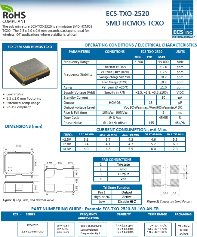 ECS晶體,ECS振蕩器,ECS-TXO-2520貼片晶振.溫補(bǔ)晶振(TCXO)產(chǎn)品本身具有溫度補(bǔ)償作用,高低溫度穩(wěn)定性:頻率精度高0.5PPM~2.0PPM,常用頻率:26M,33.6M,38.4M,40M.因產(chǎn)品性能穩(wěn)定,精度高等優(yōu)勢,被廣泛應(yīng)用到一些比較品質(zhì)的數(shù)碼通訊產(chǎn)品領(lǐng)域,導(dǎo)航定位系統(tǒng),智能手機(jī),WiMAX和無線通信等產(chǎn)品,符合RoHS/無鉛.