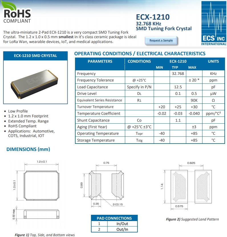 ECS晶體,伊西斯晶振,ECX-1210表晶.小型,薄型,質(zhì)地輕的表面貼片音叉型晶體諧振器,手機(jī)晶體,產(chǎn)品體積小,特別適用于各種小巧的便攜式消費(fèi)電子數(shù)碼產(chǎn)品,在移動(dòng)通信領(lǐng)域廣泛的應(yīng)用,晶振產(chǎn)品本身可發(fā)揮優(yōu)良的電氣特性,滿(mǎn)足無(wú)鉛焊盤(pán)的高溫回流溫度曲線要求.