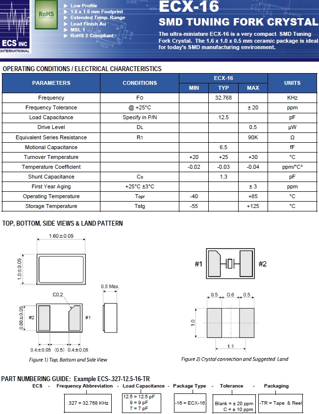 ECS晶振,貼片表晶,ECX-16諧振器.小體積貼片時鐘晶體諧振器,是貼片音叉晶體,千赫頻率元件,應用于時鐘模塊,智能手機,導航定位系統,因產品本身體積小,貼片編帶型,可應用于高性能自動貼片焊盤,被廣泛應用到各種小巧的便攜式消費電子數碼時間產品,環保性能符合ROHS/無鉛認證.