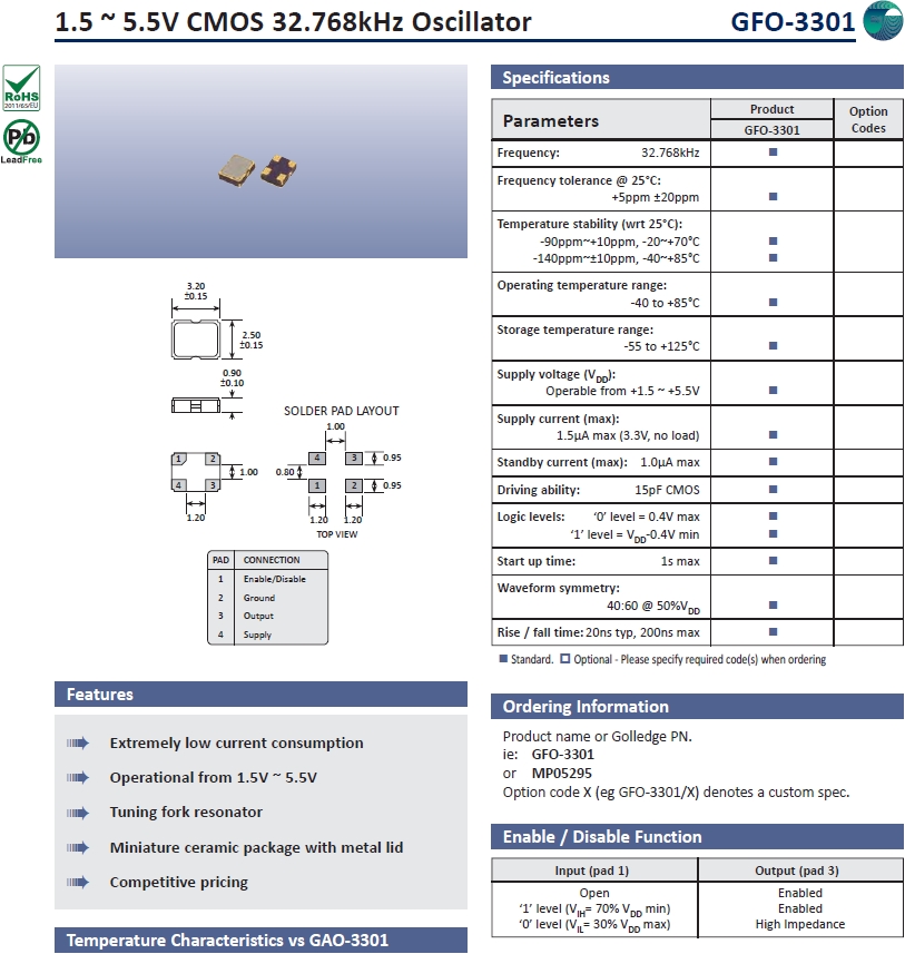 Golledge晶振,時鐘振蕩器,GFO-3301貼片晶振.小體積貼片時鐘晶體諧振器,是貼片音叉晶體,千赫頻率元件,應(yīng)用于時鐘模塊,智能手機(jī),導(dǎo)航定位系統(tǒng),因產(chǎn)品本身體積小,貼片編帶型,可應(yīng)用于高性能自動貼片焊盤,被廣泛應(yīng)用到各種小巧的便攜式消費電子數(shù)碼時間產(chǎn)品,環(huán)保性能符合ROHS/無鉛認(rèn)證.