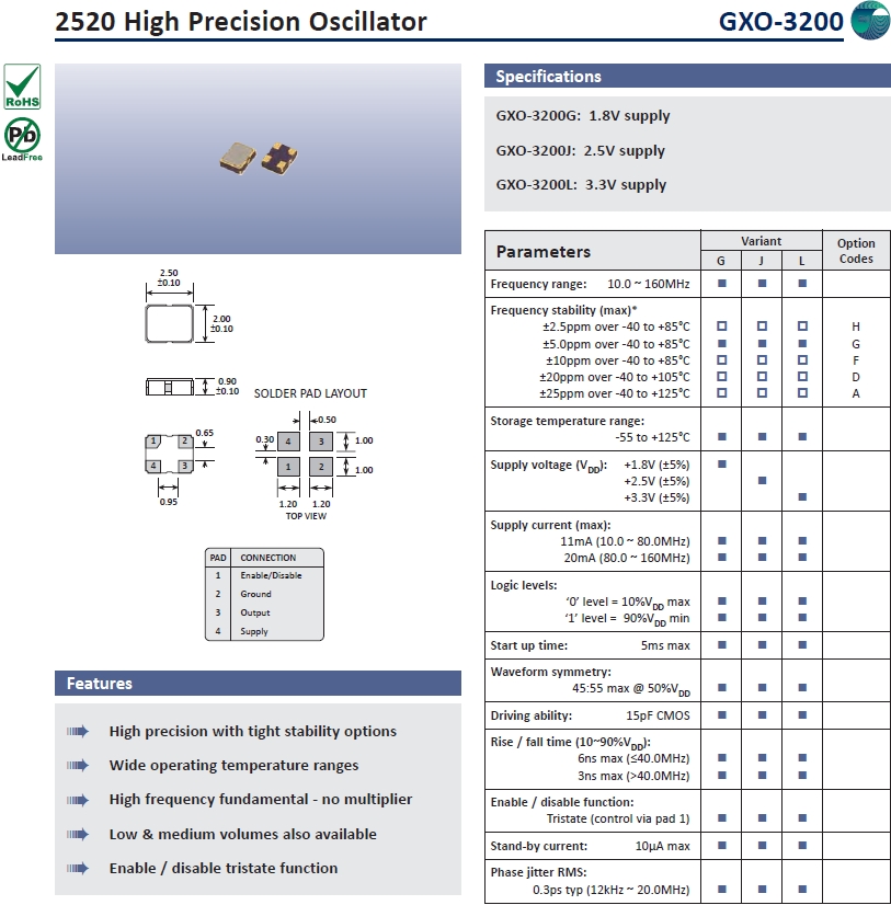 Golledge晶體,高利奇晶振,GXO-3200水晶振蕩子.小型貼片有源晶振,體積的變小也使產(chǎn)品帶來了更高的穩(wěn)定性能,接縫密封石英晶體振蕩器,精度高,覆蓋頻率范圍寬的特點,貼片高速自動安裝和高溫回流焊設(shè)計,Optionable待機輸出三態(tài)輸出功能,電源電壓范圍:1.8V?5V,高穩(wěn)定性,低抖動,低功耗,主要應(yīng)用領(lǐng)域:無線通訊,智能手機,平板筆記本W(wǎng)LAN,藍牙,數(shù)碼相機,DSL和各式IT產(chǎn)品的晶振應(yīng)用,三態(tài)功能,PC和LCDM等數(shù)碼領(lǐng)域,符合RoHS/無鉛.