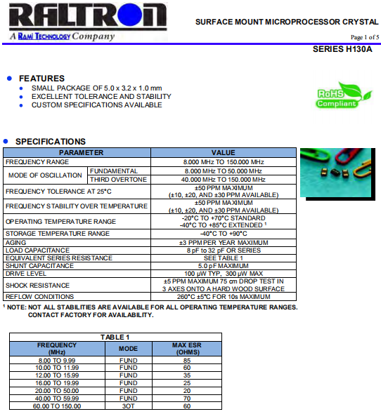 RALTRON晶振,H130A晶振,石英晶體諧振器.小型石英貼片5032晶振,外觀尺寸具有薄型表面貼片型石英晶體諧振器,特別適用于有小型化要求的市場領域,比如智能手機,無線藍牙,平板電腦等電子數碼產品.晶振本身超小型,薄型,重量輕,晶體具有優良的耐環境特性,如耐熱性,耐沖擊性,在辦公自動化,家電相關電器領域及Bluetooth,WirelessLAN等短距離無線通信領域可發揮優良的電氣特性,滿足無鉛焊接的回流溫度曲線要求.