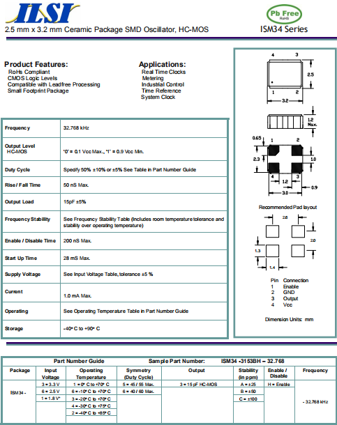 ILSI晶振,ISM34晶振,低電壓振蕩器.有源晶振,是只晶體本身起振需要外部電壓供應,起振后可直接驅動CMOS 集成電路,產品本身已實現與薄型IC(TSSOP封裝,TVSOP封裝)同樣的1mm厚度,斷開時的消費電流是15 µA以下,編帶包裝方式可對應自動搭載及IR回流焊接(無鉛對應)產品有幾種電壓供選1.8V,2.5V,3V3.3V,5V,以應對不同IC產品需要.