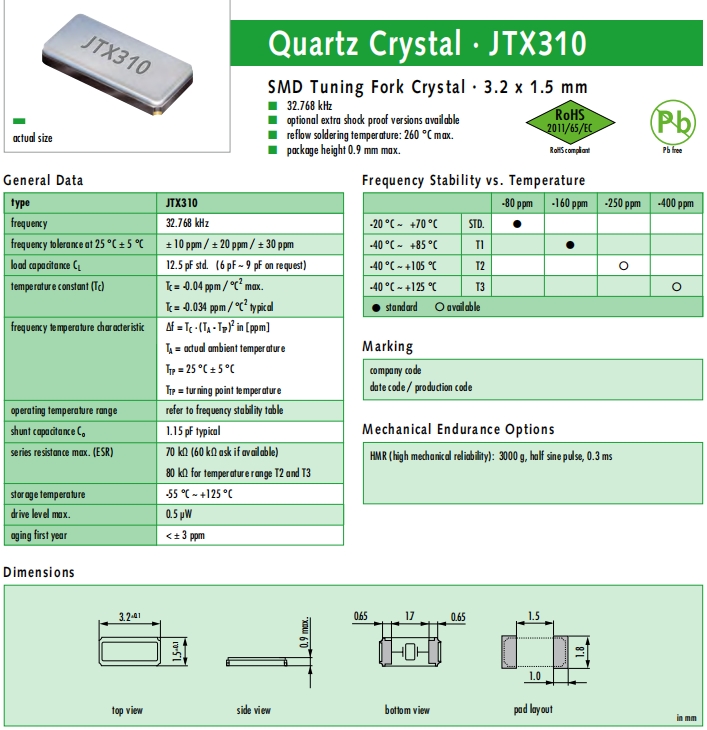 JAUCH晶振,JTX310晶振,進口壓電石英晶體.貼片表晶32.768K系列具有超小型,薄型,質地輕的表面貼片音叉型石英晶體諧振器,晶振產品本身具備優良的耐熱性,耐環境特性,在辦公自動化,家電領域,移動通信領域可發揮優良的電氣特性,符合無鉛標準,滿足無鉛焊接的回流溫度曲線要求,金屬外殼的石英晶振使得產品在封裝時能發揮比陶瓷晶振外殼更好的耐沖擊性能.
