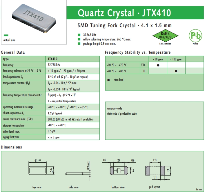 JAUCH晶振,JTX410晶振,無源環保晶體.智能手機晶振,產品具有高精度超小型的表面貼片型石英晶體諧振器,最適用于移動通信終端的基準時鐘等移動通信領域.比如智能手機,無線通信,衛星導航,平臺基站等較高端的數碼產品,晶振本身小型,薄型具備各類移動通信的基準時鐘源用頻率,貼片晶振具有優良的電氣特性,耐環境性能適用于移動通信領域,滿足無鉛焊接的高溫回流溫度曲線要求.