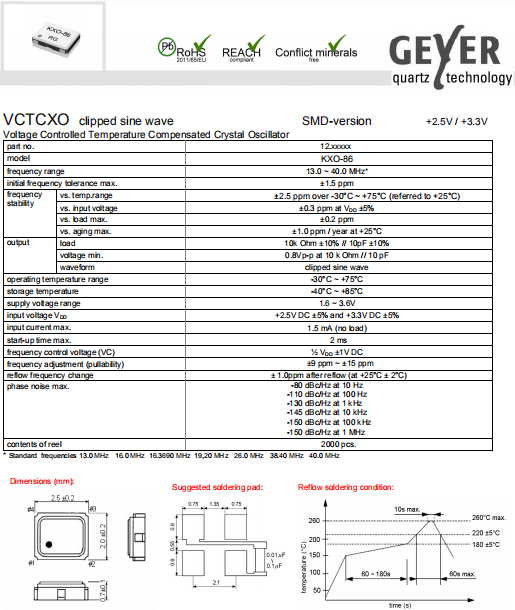 Geyer晶振,KXO-86晶振,壓控溫補晶體振蕩器.2520mm體積的石英晶體振蕩器,有源晶振,該產品可驅動2.5V的溫補晶振,壓控晶振,VC-TCXO晶體振蕩器產品,電源電壓的低電耗型,編帶包裝方式,可對應自動高速貼片機自動焊接,及IR回流焊接(無鉛對應),為無鉛產品,超小型,質地輕.產品被廣泛應用到集成電路,程控交換系統,無線發射基站.