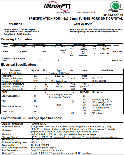 MTRONPTI晶振,M1532晶振,二腳貼片晶體.超小型,薄型,質地輕的表面貼片音叉型晶體諧振器,手機晶體,產品體積小,特別適用于各種小巧的便攜式消費電子數碼產品,在移動通信領域得到了廣泛的應用,晶振產品本身可發揮優良的電氣特性,滿足無鉛焊接的高溫回流溫度曲線要求.