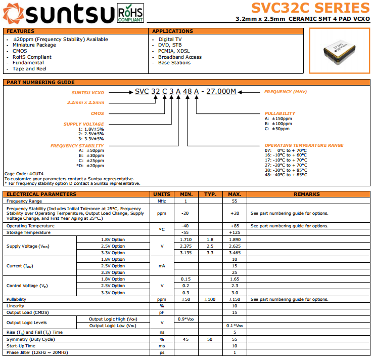 suntsu晶振,SVC32C晶振,壓控晶體振蕩器.貼片式石英晶體振蕩器,低電壓啟動功率,并且有多種電壓供選擇,比如有1.8V,2.5V,3.3V,3.8V,5V等,產品被廣泛應用于,平板筆記本,GPS系統,光纖通道,千兆以太網,串行ATA,串行連接SCSI,PCI-Express的SDH / SONET發射基站等領域.符合RoHS/無鉛.