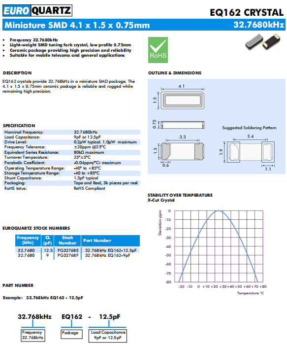 移動(dòng)電信6G晶振,32.768kHz EQ162-12.5pF,EUROQUARTZ電腦主板晶振,SMD石英晶體,兩腳貼片晶振,參數(shù)表
