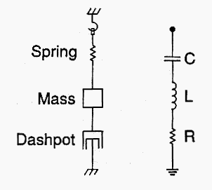 機械振動系統和圖2所示的電路是"等效的",因為每個都可以用相同的微分方程[6]來描述.質量,彈簧和阻尼元件(即緩沖器)對應于電感器,電容器和電阻器.驅動力對應于電壓,質量對電容器上的電荷的位移以及對電流的速度.