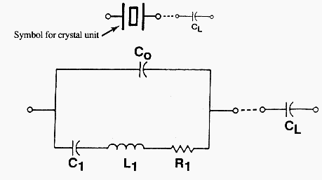石英晶振是一種機械振動系統,通過壓電效應與電氣世界相連.圖3示出了諧振器的(簡化的)等效電路(一種振動模式),以及晶體單元的電路符號.負載電容器CL與晶體串聯示出.C0,稱為"分流"電容,是由于晶體板上的電極加上由于晶體外殼引起的雜散電容引起的電容.電路的R1,L1,C1部分是"運動臂",它由晶體的機械振動產生.