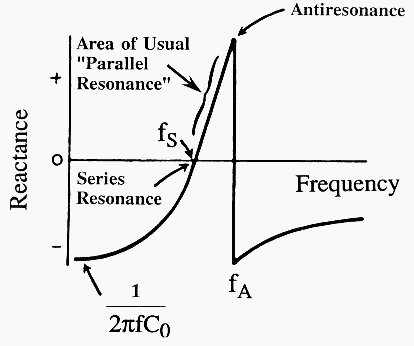 C0至C1比率是存儲在石英晶體中的電能和機械能之間的相互轉換的量度,即壓電耦合因子k的量值.C0/C1隨著泛音數的平方增加;C0/C1與k和N的關系為2C0/C1=[pN2/2k],其中N是泛音數.當直流電壓施加到諧振器的電極時,電容比C0/C1還可以測量由電極形成的電容器中存儲的電能與由壓電效應產生的晶格應變引起的在晶體中彈性存儲的能量之比.圖4顯示了晶體單元的電抗與頻率特性.C0/C1也與反共振諧振頻率分離(即極柱間距)成反比,這是貼片濾波器應用中特別重要的參數.電抗對鄰近F頻率曲線的斜率小號成反比到C1,即,DX/(DF/F)»1/PFC1附近?F小號,其中X是電抗.C1因此,它是衡量晶體"剛度"的一種方法,即它的可調性.