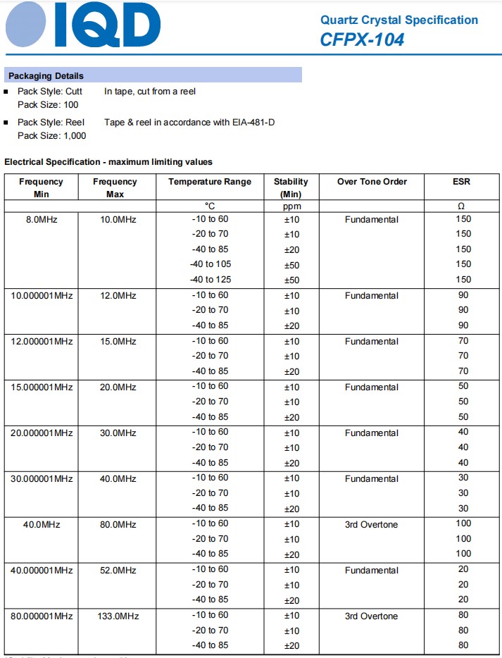 | LFXTAL053798REEL | IQD晶振 | CFPX-104 | CRYSTAL 24.0000MHZ 18PF SMD | 24 MHz |