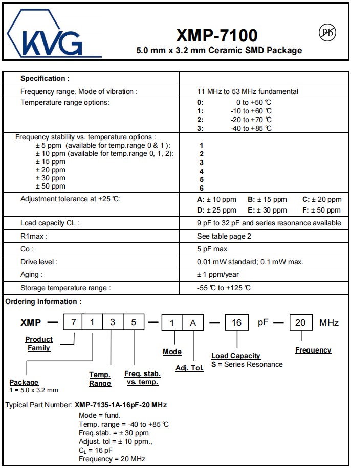 XMP-7100,XMP-7135-5E-18pF-20MHz,KVG超小型晶振,5032mm,參數表