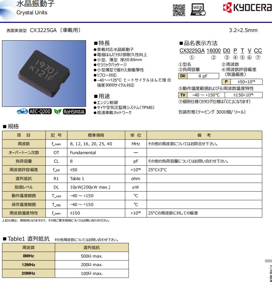 | CX3225GA16000D0PTVCC | Kyocera晶振 | CX3225GA, Kyocera | MHz Crystal | 16MHz | -40°C ~ 150°C |