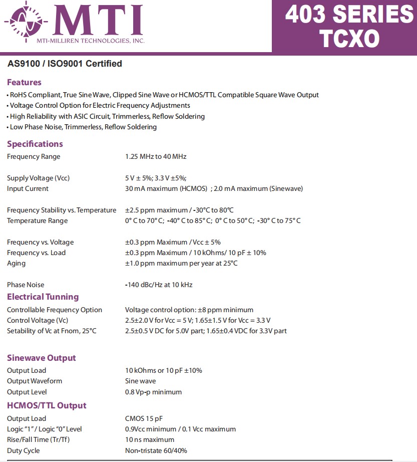 米利倫TCXO晶振,403系列石英貼片晶振,物聯網應用晶振,羅拉LORA模塊晶振,高性能晶振,參數表