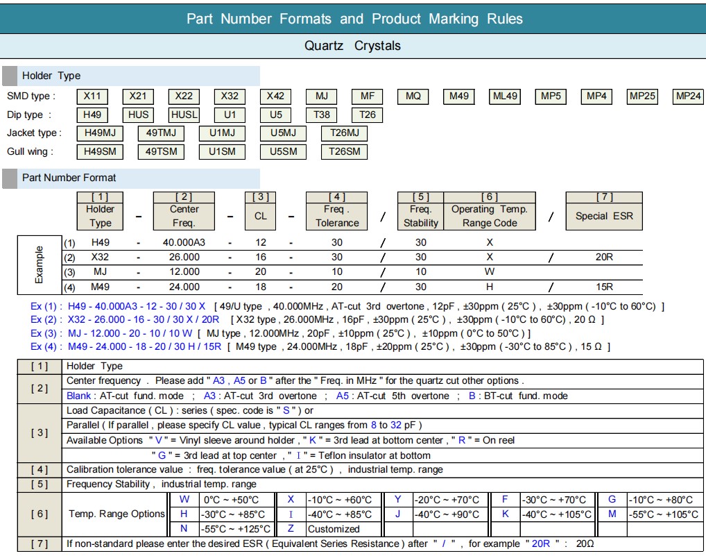 | Frequency Tolerance | AT- cut : ± 10 ppm , ± 20 ppm or ± 30 ppm at 25°C |