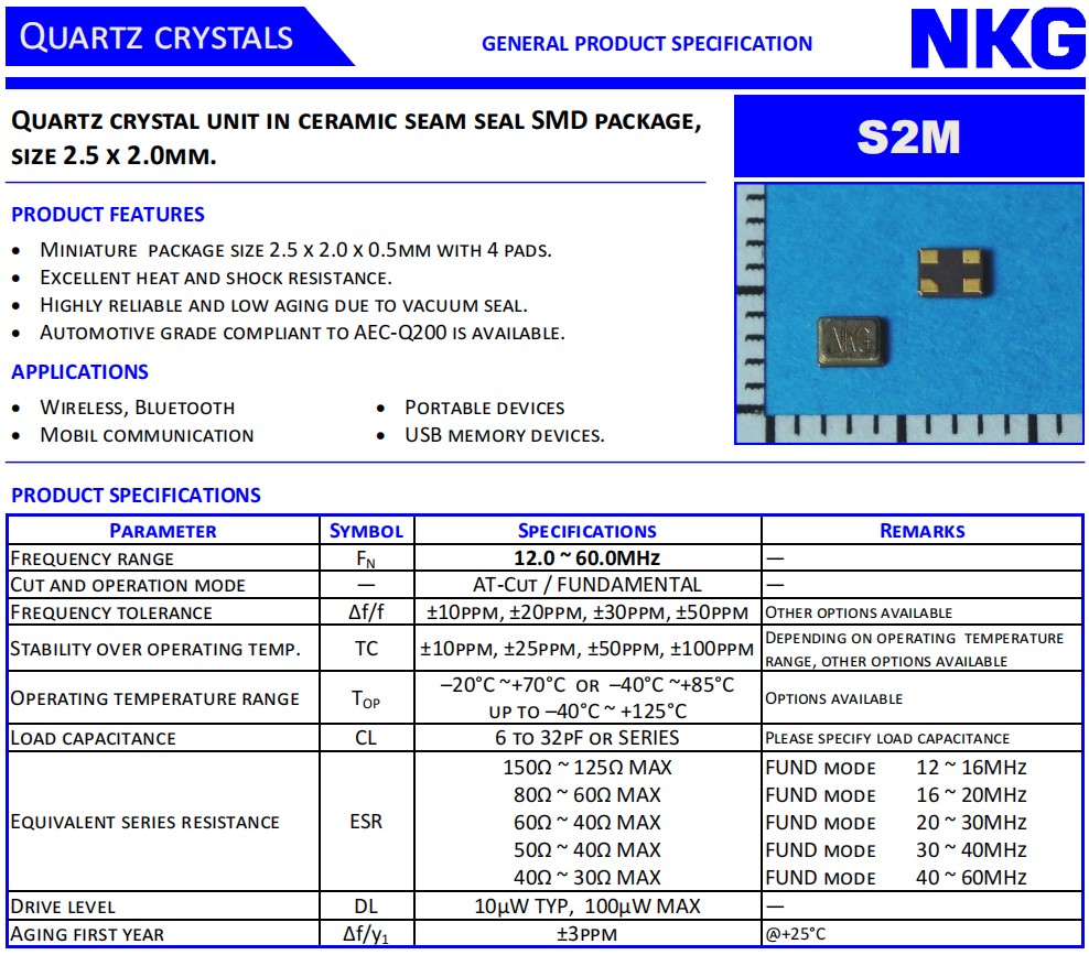NKG車規(guī)晶振,S2M16.0000F18M23-EXT,6G無線模塊晶振,參數(shù)表