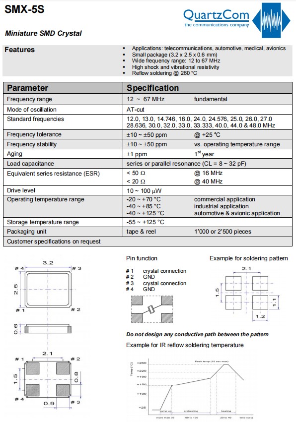 汽車電子設(shè)備6G晶振,SMX-5S,QuartzCom耐高溫晶振,3225mm石英晶振,輕薄型晶振,瑞士進口晶振,QuartzCom石英通晶振,型號:SMX-5S,寬頻率范圍為:12MHz~67MHz,小體積晶振尺寸:3.2x2.5x0.6mm封裝,四腳貼片晶振,無源晶振,石英晶體諧振器,石英晶振,無鉛環(huán)保晶振,微型SMD晶體。工作溫度范圍選項:-20 ~ +70°C商業(yè)應用,-40 ~ +85°C工業(yè)應用,-40 ~ +125°C汽車和航空電子應用。3225晶振具有超小型晶振,輕薄型晶振,高沖擊和振動電阻率,回流焊@260°C,耐熱及耐環(huán)境特點。應用于:電信設(shè)備、醫(yī)療設(shè)備,航空電子設(shè)備,血壓計晶振,安防設(shè)備,商業(yè),工業(yè)等應用。