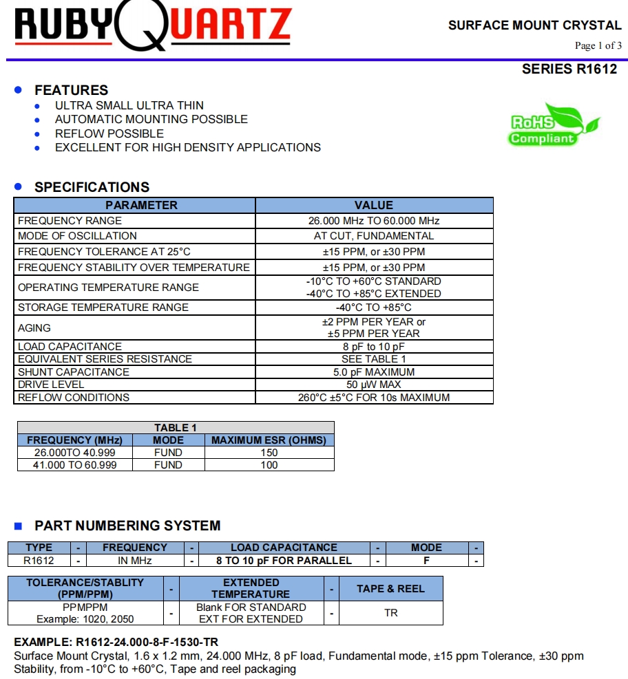 6G藍牙晶振,R1612-30.000-8-F-1530-TR,Rubyquartz盧柏晶體 參數(shù)表