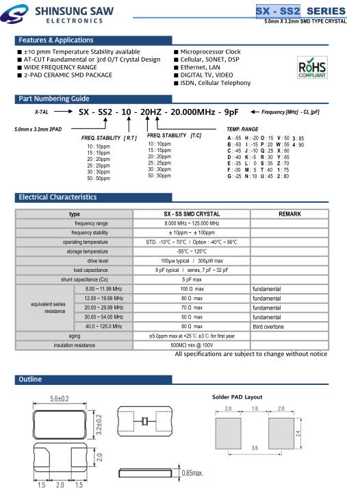 美國SHINSUNG晶振,SX-SS2兩腳貼片晶振,SX-SS2-10-15HZ-24.000MHz-9pF晶振,小型表面貼片晶振型,是標準的石英晶體振蕩器,適用于寬溫范圍的電子數碼產品,家電電器及MP3,MP4,播放器,單片機等領域.可對應8.000MHz以上的頻率,在電子數碼產品,以及家電相關電器領域里面發揮優良的電氣特性,滿足無鉛焊接的回流溫度曲線要求.