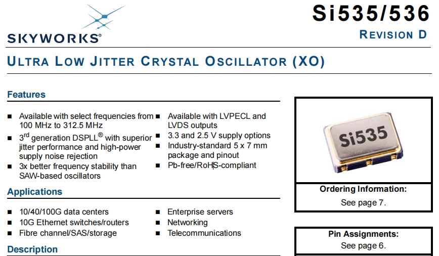 | 536FB312M500DGR | Skyworks有源晶振 | XTAL OSC XO 312.5000MHZ LVDS SMD | Si536 | 312.5 MHz | LVDS |
