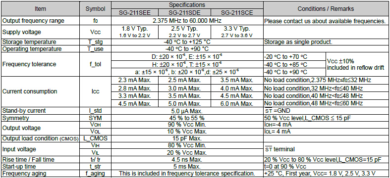 SG-211SEE,SDE,SCE振蕩器,愛普生有源晶振,“SG-211SEE 38.4000MD0”家電冰箱晶振,頻率范圍1.0MHz~60.0MHz,電源電壓3.3V,功能使能(OE),外部尺寸規格7.0×5.0×1.4mm,主要應用領域:無線通訊,高端智能手機,平板筆記本WLAN,藍牙,數碼相機,DSL和其他IT產品的晶振應用,三態功能,PC和LCDM等高端數碼領域,符合RoHS/無鉛.
