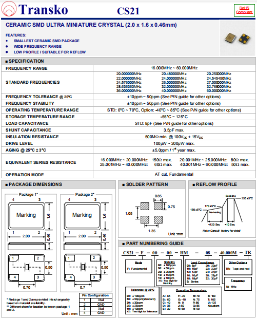 Transko晶振,CS21晶振,高性能石英晶體,貼片石英晶體,體積小,焊接可采用自動貼片系統,產品本身小型,表面貼片晶振,特別適用于有小型化要求的電子數碼產品市場領域,因產品小型,薄型優勢,耐環境特性,包括耐高溫,耐沖擊性等,在移動通信領域得到了廣泛的應用,晶振產品本身可發揮優良的電氣特性,滿足無鉛焊接的高溫回流溫度曲線要求.