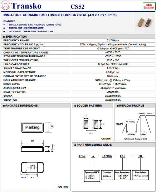 Transko晶振,CS52晶振,高品質石英晶體,小體積SMD時鐘晶體諧振器,是貼片晶振,千赫頻率元件,應用于時鐘模塊,智能手機,全球定位系統,因產品本身體積小,SMD編帶型,可應用于高性能自動貼片焊接,被廣泛應用到各種小巧的便攜式消費電子數碼時間產品,環保性能符合ROHS/無鉛標準.