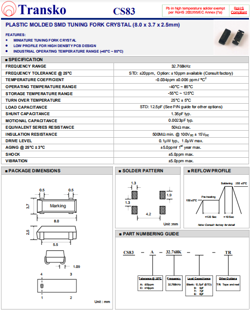 Transko晶振,CS83晶振,進(jìn)口SMD晶體,32.768K時(shí)鐘晶體具有小型,薄型,輕型的貼片晶振表面音叉型晶體諧振器,產(chǎn)品具有優(yōu)良的耐熱性,耐環(huán)境特性,可發(fā)揮晶振優(yōu)良的電氣特性,符合RoHS規(guī)定,滿足無鉛焊接的高溫回流溫度曲線要求,金屬外殼的封裝使得產(chǎn)品在封裝時(shí)能發(fā)揮比陶瓷諧振器外殼更好的耐沖擊性.