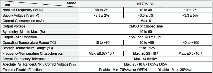 NT7050BC貼片晶振,NDK有源晶振,汽車電子產品晶振,采用小型封裝:7.0×5.0×2.0mm,帶有Enable/Disable(Stand-by)功能,最高工作溫度 +105°C(溫度特性± 0.5×10-6),頻率溫度特性± 0.07 × 10-6(工作溫度范圍-10 to +70°C),低消耗電流 : Max. 6mA,輸出電壓可選擇CMOS或Clipped Sine.