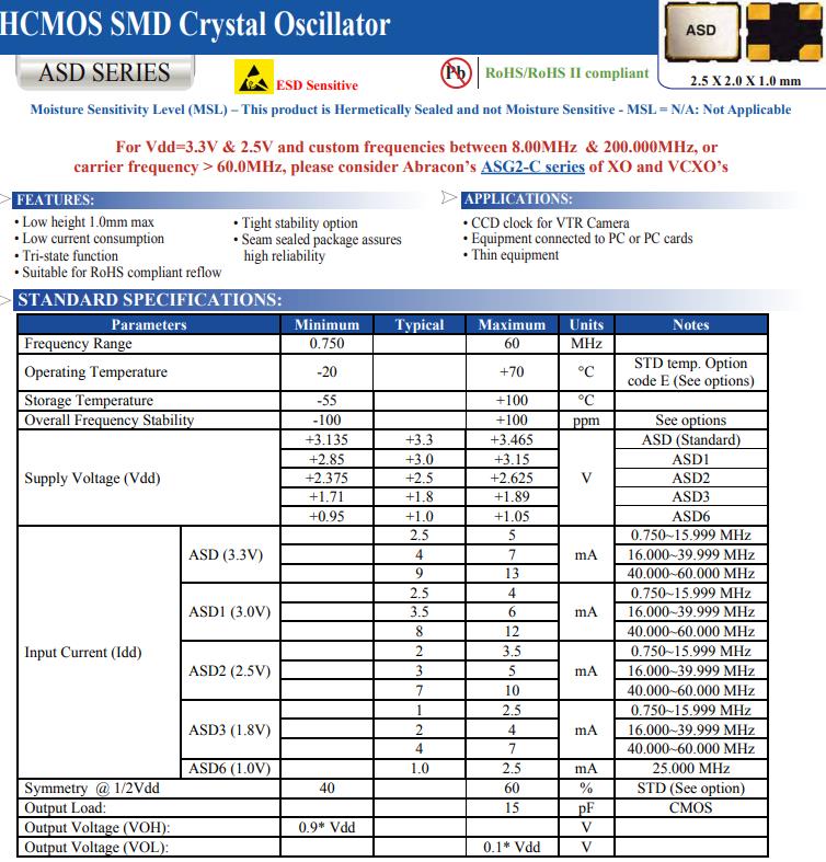 Abracon晶振公司推出了編碼ASD3-27.000MHZ-LR-T,型號ASD,OSC振蕩器,XO時鐘振蕩器, 尺寸為2520mm,頻率27MHz,輸出HCMOS,電壓1.8V,腳位4-SMD,高度低,最大1.0毫米,低電流消耗,三態功能,適合符合RoHS標準的回流,緊密穩定性選項,接縫密封包裝,確保高可靠性,應用:VTR攝像機的CCD時鐘,連接到PC或PC卡的設備,薄型設備.