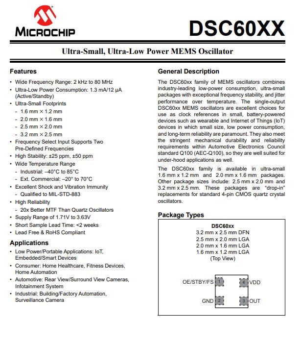 | DSC1033CI1-048.0000 | Microchip有源晶體振蕩器 | DSC1033 | MEMS (Silicon) | 48MHz | 3.3V |