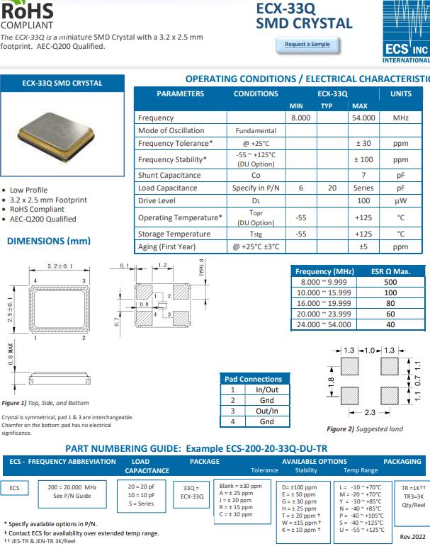 | ECS-240-18-33Q-DS | ECS晶振 | ECX-33Q | 24MHz | -40°C ~ 125°C |