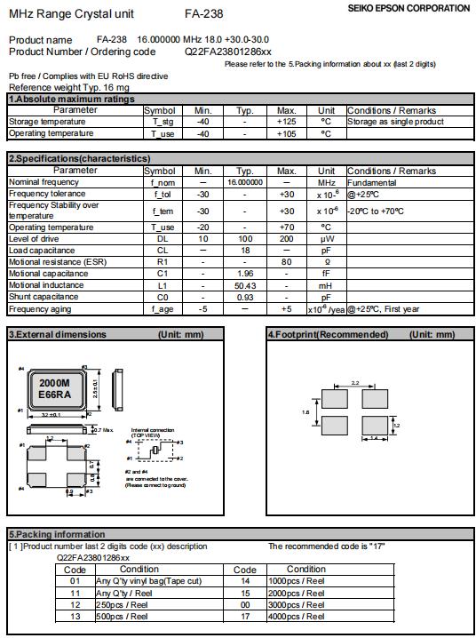 專用于電子門控制器的無源晶振編碼一覽表Q22FA2380128616,在無線通訊產品中一個無線通訊產品就要用到一顆晶振,最常見的通信設備上的時間顯示就要一款為FA-238無源晶振,為了滿足市場需求,由愛普生晶振公司推出的一款FA-238無源基頻晶振,因基頻晶振穩定性更高,非常適用于通信設備、工業電子、汽車電子、消費電子行業,最典型的應用為時鐘和微機。