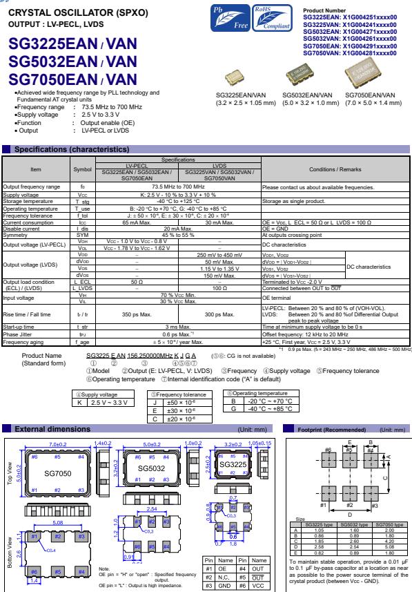 | X1G004281007100 | SG7050VAN | 156.250000 MHz | 7.00 x 5.00 x 1.60 mm | LVDS | 2.250 to 3.630 V | -20 to 70 °C |