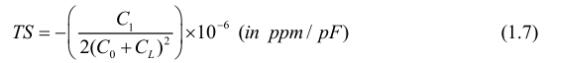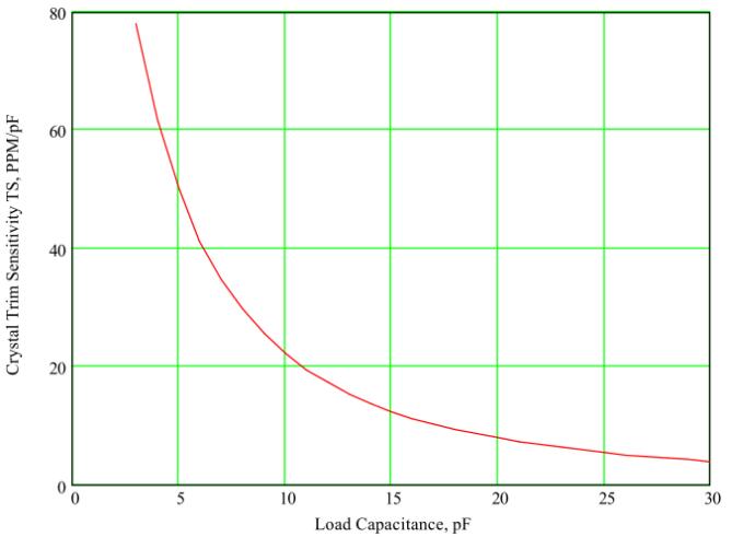 晶體制造商將晶體給定的負(fù)載電容的方程式(1.7)稱為“微調(diào)靈敏度”。 圖4是“修剪靈敏度”的圖形表示。